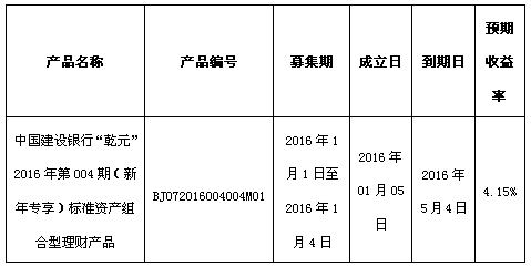 中国建设银行“乾元”2016年第004期(新年专享)标准资产组合型理财产品成立公告