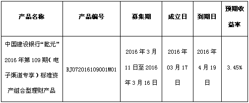 中国建设银行“乾元”2016年第109期(电子渠道专享)标准资产组合型理财产品成立公告