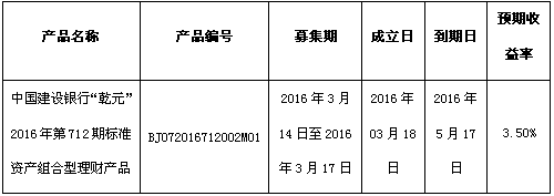 中国建设银行“乾元”2016年第712期标准资产组合型理财产品成立公告