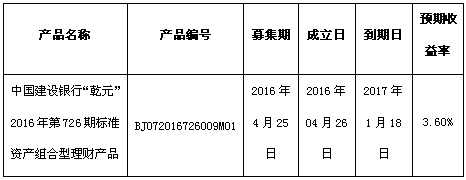 中国建设银行“乾元”2016年第726期标准资产组合型理财产品成立公告