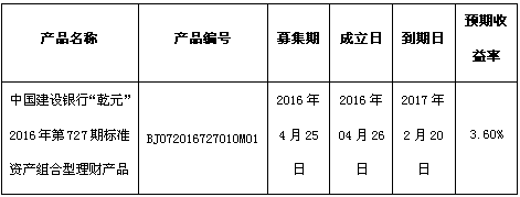 中国建设银行“乾元”2016年第727期标准资产组合型理财产品成立公告