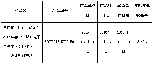 中国建设银行“乾元”2016年第157期(电子渠道专享)标准资产组合型理财产品兑付公告