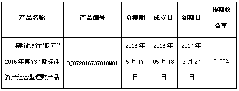 中国建设银行“乾元”2016年第737期标准资产组合型理财产品成立公告
