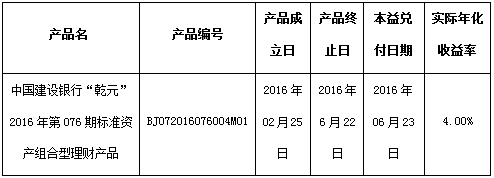 根据与投资者的约定,中国建设银行北京市分行发行的下列理财产品已经到期,现将理财产品兑付及清算情况进行信息披露: