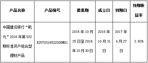 中国建设银行“乾元”2016年第522期标准资产组合型理财产品成立公告