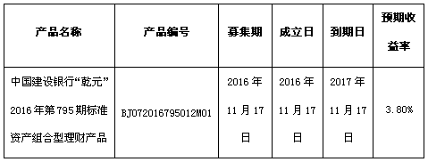 中国建设银行“乾元”2016年第795期标准资产组合型理财产品成立公告