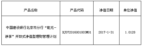 中国建设银行北京市分行“乾元-净享”开放式净值型理财管理计划净值公布如下: