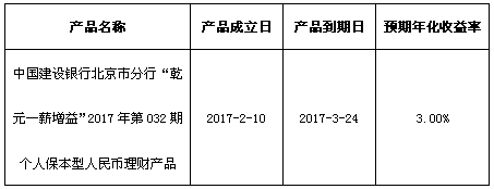 关于中国建设银行北京市分行“乾元—薪增益”2017年第032期个人保本型人民币理财产品成立的公告
