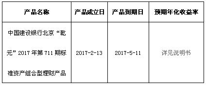 关于中国建设银行北京“乾元”2017年第711期标准资产组合型理财产品成立的公告