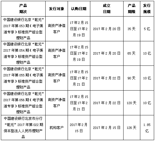 中国建设银行北京市分行定于2017年2月15日发行理财产品,现将相关发行情况公告如下: