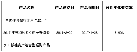 关于中国建设银行北京“乾元”2017年第054期(电子渠道专享)标准资产组合型理财产品成立的公告