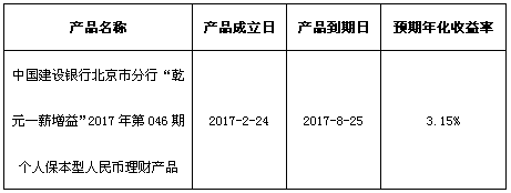 关于中国建设银行北京市分行“乾元—薪增益”2017年第046期个人保本型人民币理财产品成立的公告