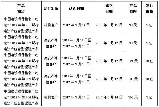 中国建设银行北京市分行定于2017年3月14日发行理财产品,现将相关发行情况公告如下: