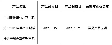 关于中国建设银行北京“乾元”2017年第731期标准资产组合型理财产品成立的公告