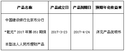 关于中国建设银行北京市分行“乾元”2017年第051期保本型法人人民币理财产品成立的公告