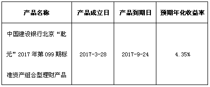 关于中国建设银行北京“乾元”2017年第099期标准资产组合型理财产品成立的公告