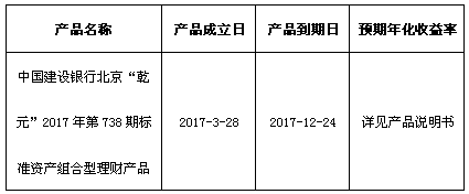 关于中国建设银行北京“乾元”2017年第738期标准资产组合型理财产品成立的公告