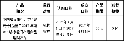 中国建设银行北京市分行定于2017年4月1日发行理财产品,现将相关发行情况公告如下: