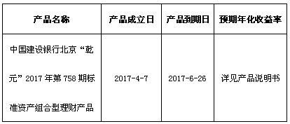 关于中国建设银行北京“乾元”2017年第758期标准资产组合型理财产品成立的公告