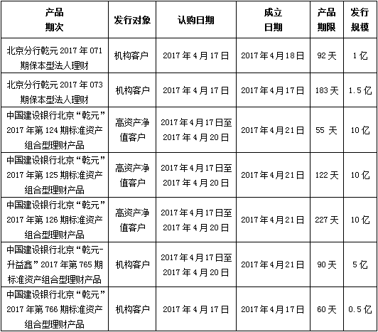 中国建设银行北京市分行定于2017年4月17日发行理财产品,现将相关发行情况公告如下: