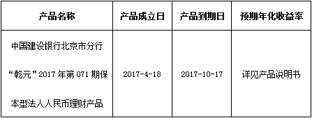 关于中国建设银行北京市分行“乾元”2017年第071期保本型法人人民币理财产品成立的公告