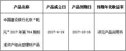 关于中国建设银行北京“乾元”2017年第764期标准资产组合型理财产品成立的公告