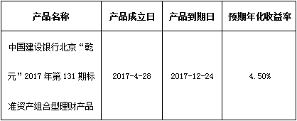 关于中国建设银行北京“乾元”2017年第131期标准资产组合型理财产品成立的公告
