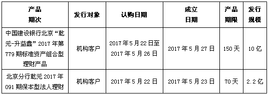 中国建设银行北京市分行定于2017年5月22日发行理财产品,现将相关发行情况公告如下:
