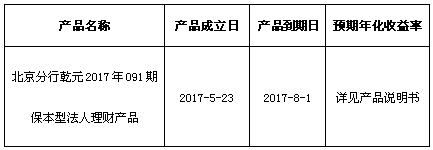 关于北京分行乾元2017年091期保本型 法人理财产品成立的公告