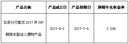 关于北京分行乾元2017年097期保本型法人理财产品成立的公告