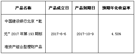 关于中国建设银行北京“乾元”2017年第193期标准资产组合型理财产品成立的公告
