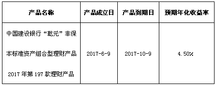 关于中国建设银行“乾元”非保本标准资产组合型理财产品2017年第197款理财产品成立的公告
