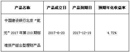 关于中国建设银行北京“乾元”2017年第210期标准资产组合型理财产品成立的公告