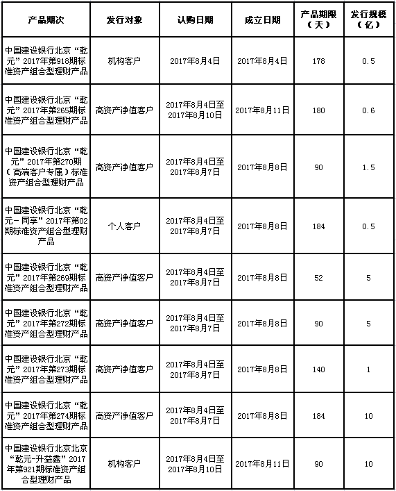 中国建设银行北京市分行定于2017年8月4日发行理财产品,现将相关发行情况公告如下: