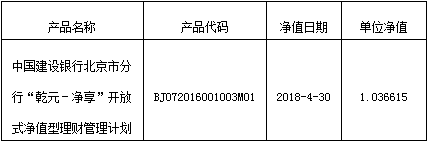 中国建设银行北京市分行“乾元-净享”开放式净值型理财管理计划净值公布如下: