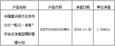 中国建设银行北京市分行“乾元-净享”开放式净值型理财管理计划净值公布如下: