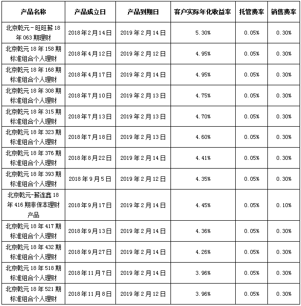 注:上述产品按照说明书中关于资产的投资类型和比例的约定进行投资,所投资非标准化债权资产已进行披露,产品运作收益超出客户实际年化收益率、托管费率及销售费率的部分将作为产品的浮动管理费用。特此公告。