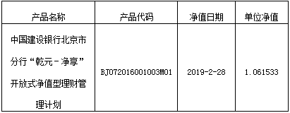 中国建设银行北京市分行“乾元-净享”开放式净值型理财管理计划净值公告