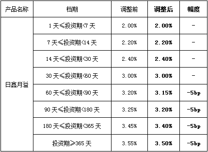 中国建设银行北京市分行拟于2019年7月18日(含)起,调整中国建设银行北京市分行“乾元-日鑫月溢”(按日)(产品编号:ZH072011001000Y01)、“乾元-天天享”(按日)(产品编号:BJ072016001000Y01)、“乾元-天天尊享”(按日)(产品编号:BJZX2017001000Y01)、“乾元-对公尊享”(按日)(产品编号:BJ072018002002D01)开放式资产组合型人民币理财产品客户预期年化收益率,具体如下表: